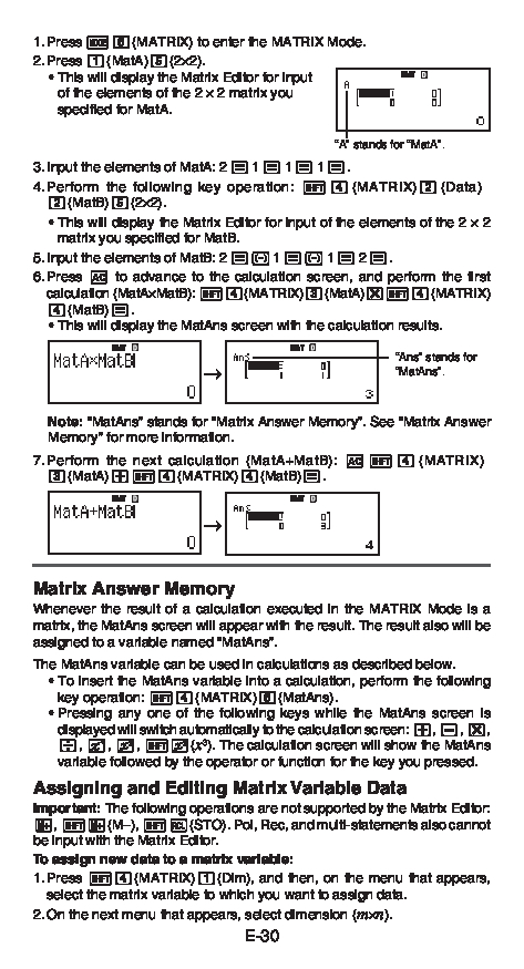 Use the matrix mode to perform calculations involving matrices of up to 3 rows by 3 columns . Once the students can utilize their calculator throughout matrix computation in numerical methods, they can expand their ability to any other problems involving . The following are the menu items on the matrix menu that appears when you press 14(matrix). official casio scientific & graphing calculator website just as textbook display / easy as no manual necessary for a wide range of topics. How to multiply the two matrices via casio fx 570es plus.